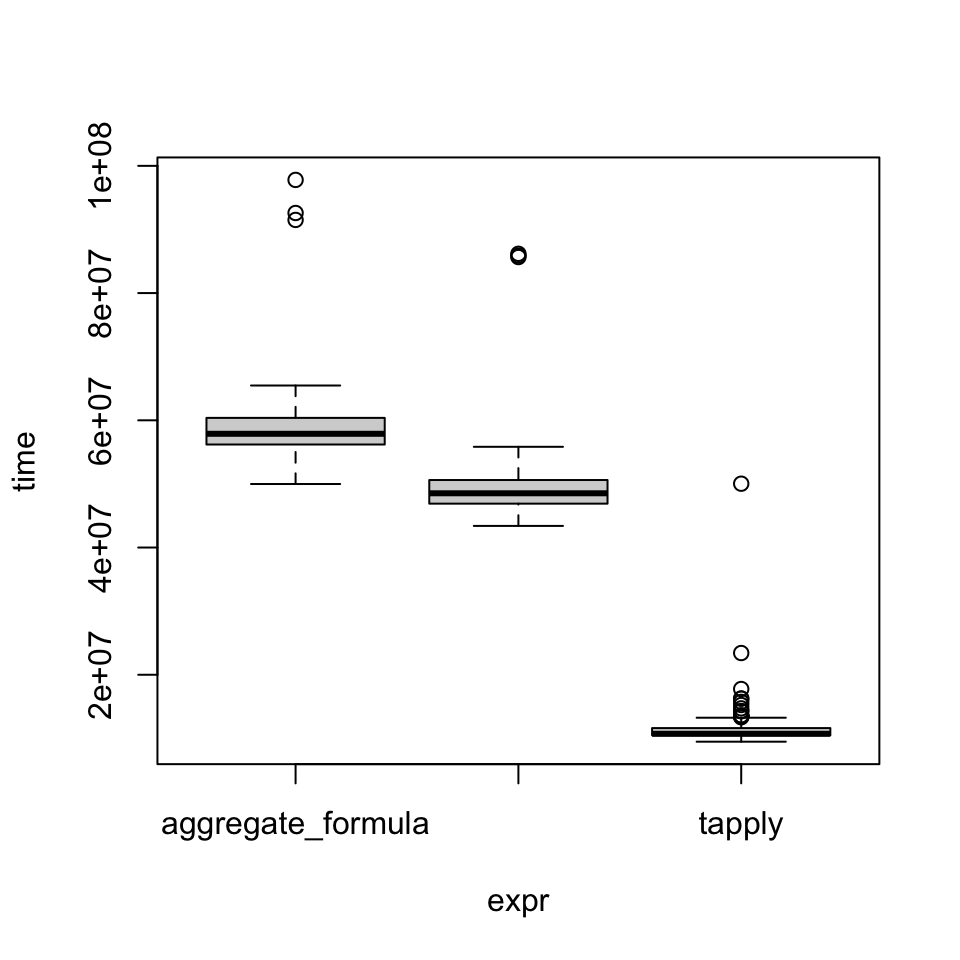The microbenchmark package’s microbenchmark() function allows you to time the execution of multiple expressions with sub-millisecond accuracy. It will execute each command a number of times as defined by the times argument (default = 100), and output statistics of execution time per expression in nanoseconds. Using plot() on the output produces a boxplot comparing the time distributions.