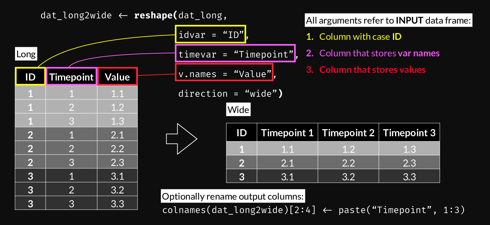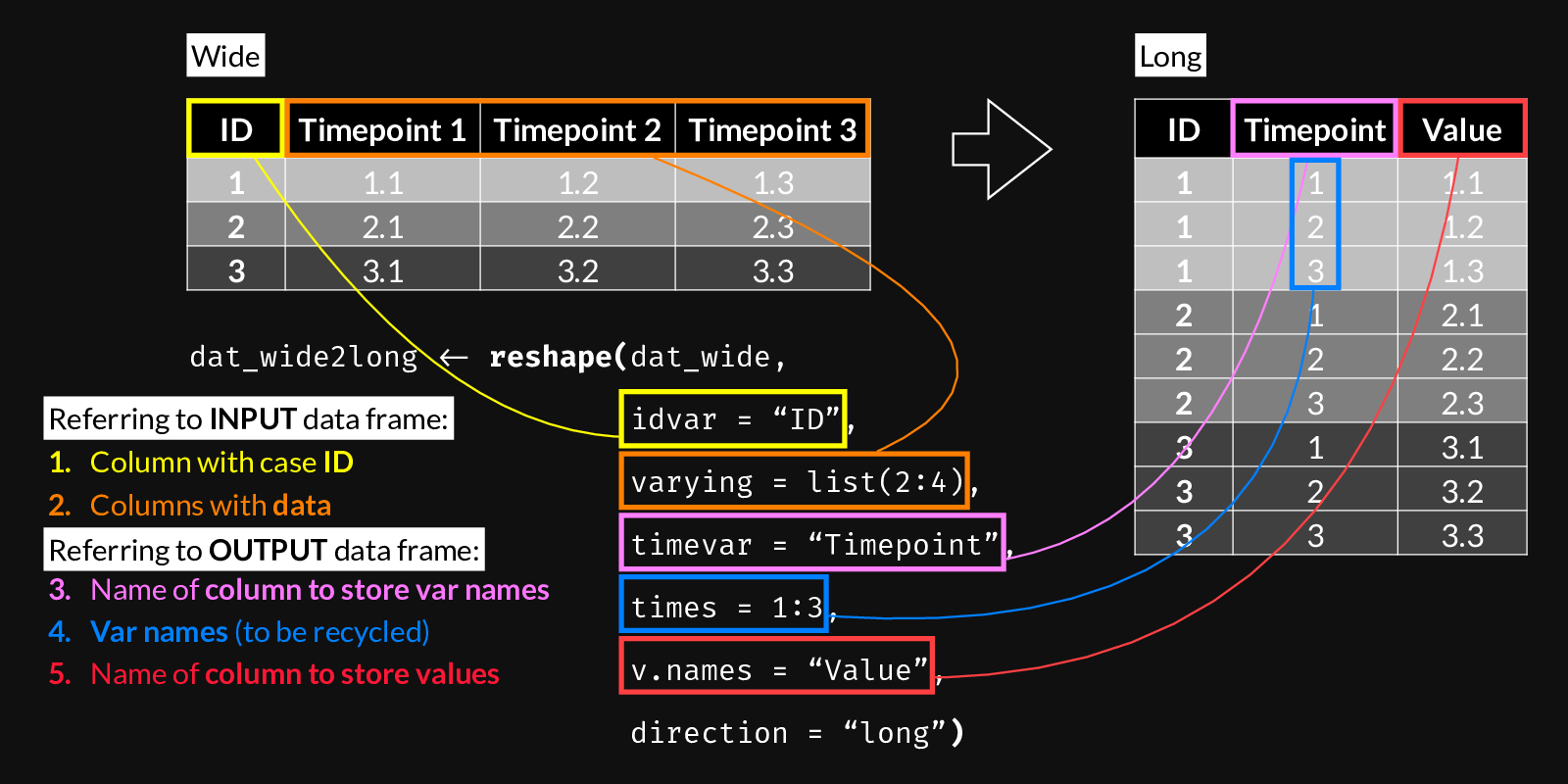 Use the following figure to understand reshape()’s long-to-wide syntax. You can use it as a reference when building a call to reshape() by following steps 1 through 3.