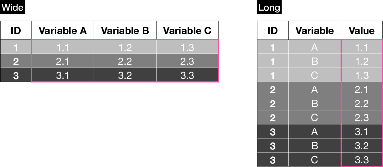Figure 26.1: Wide and Long data format example. Notice how the wide table on the left with 3 cases (3 unique IDs) and 3 variables can be represented as a 3 x 4 table in wide format or a 9 x 3 table in long format. The values (outlined in magenta) are present once in each table: on the wide table they form an ID x Variable matrix, while on the long they are stacked on a single column. The IDs have to be repeated on the long table, once for each variable and there is a new ‘Variable’ column to provide the information present in the wide table’s column names.